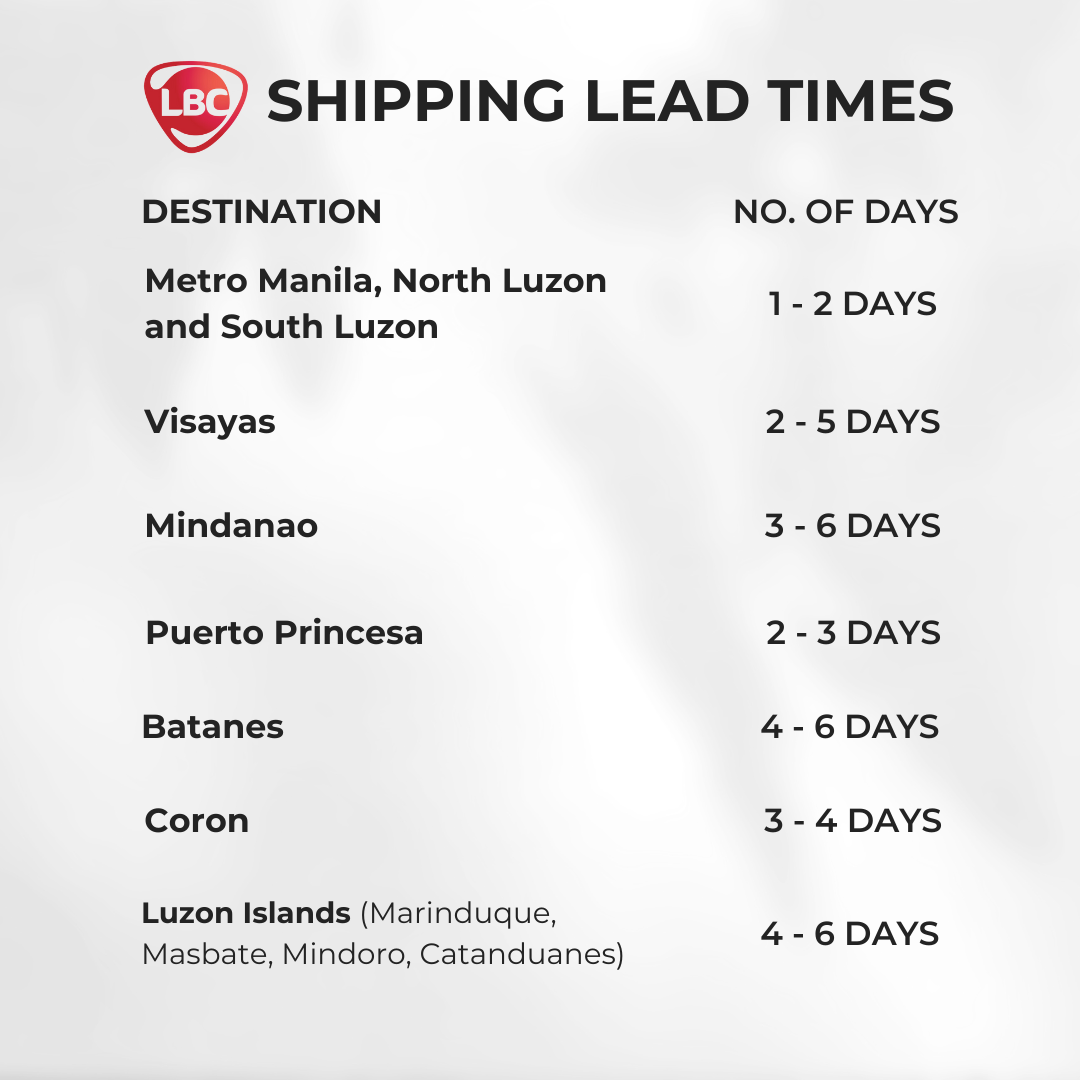 All our items are shipped from our office at San Pablo City, Laguna. For express deliveries such as Grab or Lalamove, we request that bookings be taken care of by the client to ensure proper and smooth delivery.