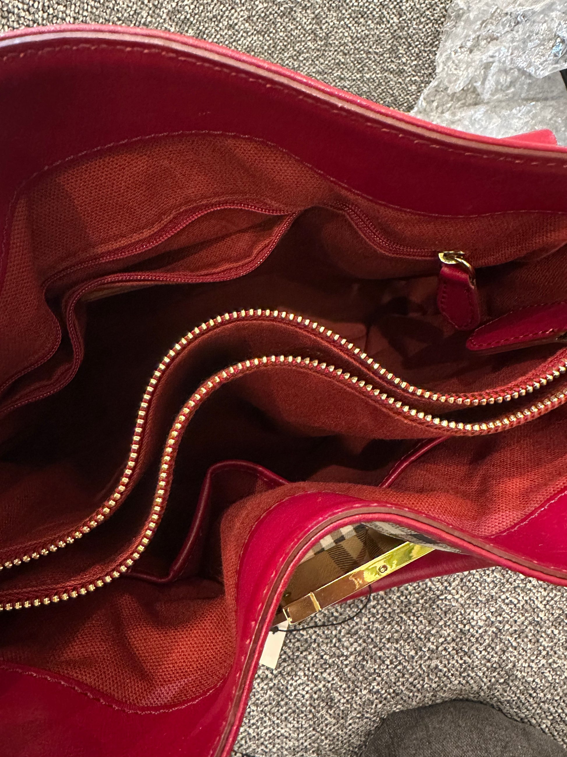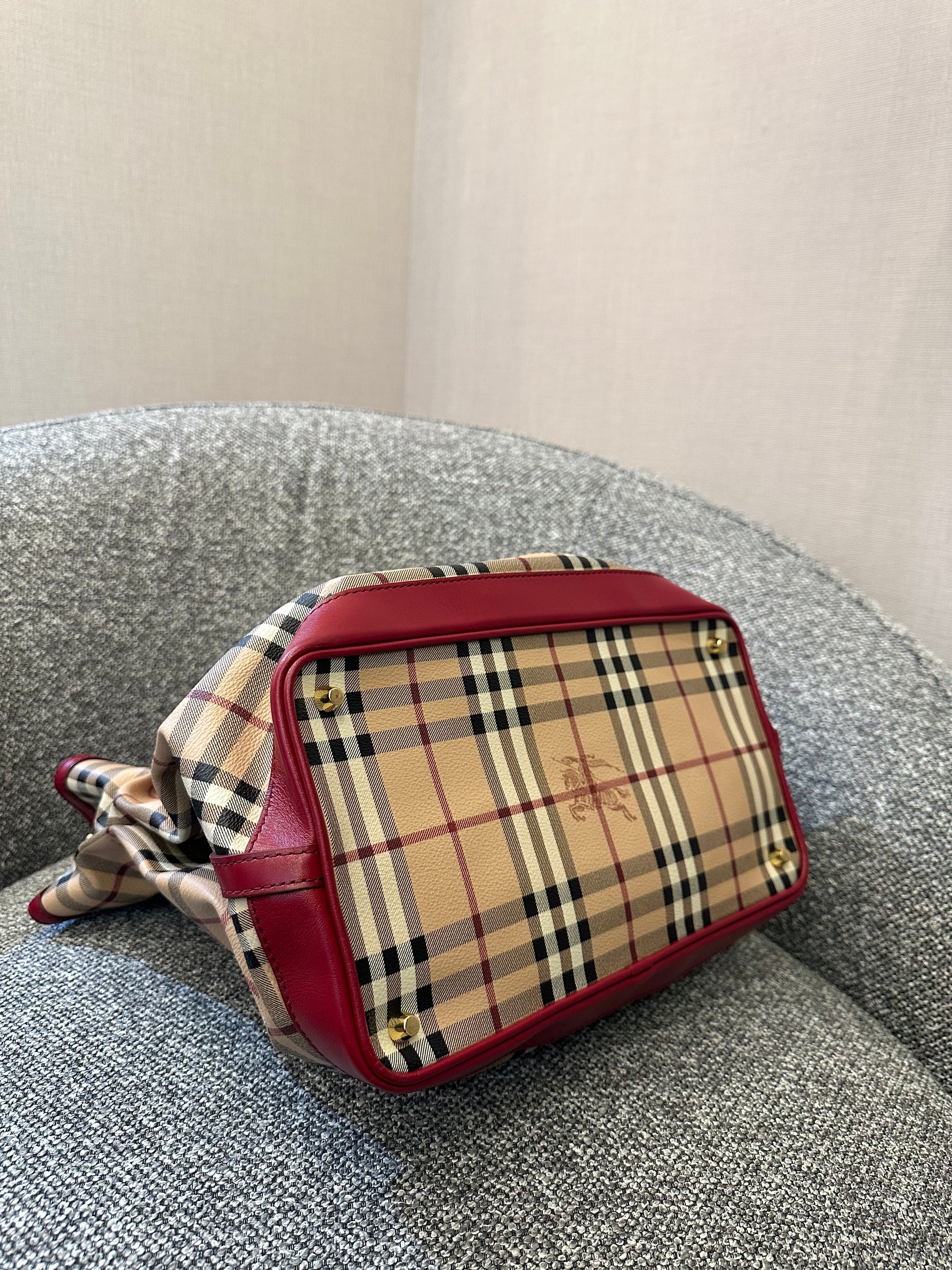 Burberry Haymarket Check Coated Canvas Belted Tote Bag with Red Leather Trim