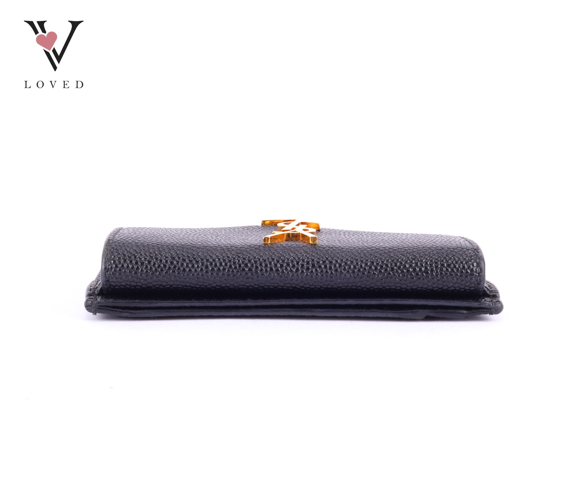The item shows subtle signs of gentle use, with only minor tarnishing on the logo, yet it retains a pristine, sophisticated appearance overall.